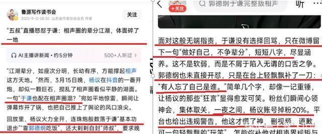 十、真假“于谦” 2025年下半年,相声圈发生了一个让人啼笑皆非的乌龙事件“于谦告杨议”。 很多相声圈自媒体疯传,相声演员杨议在直播间里骂于谦,于谦给杨议发了律师函索赔两百万,杨议立刻删视频并在直播间里澄清。