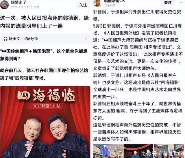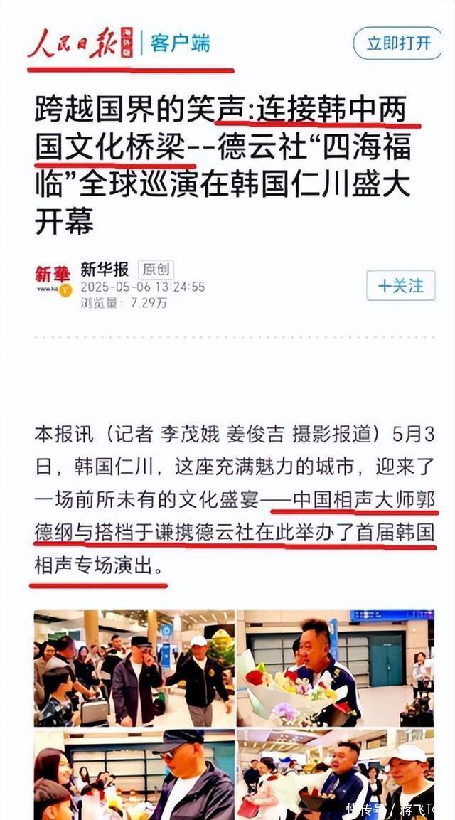 五、真假“人民日报” 2025年5月初,相声演员曹云金和新华社搞了一次合作,没过几天,一些相声圈自媒体疯狂宣传“人民日报表扬郭德纲”。 自媒体们引用的文章标题是《跨越国界的笑声:连接韩中两国文化桥梁—德云社四海福临全球巡演在韩国仁川盛大开幕》。