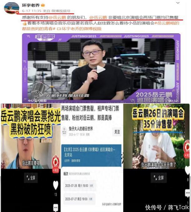 七、真假“售罄” 2025年6月,德云社相声演员岳云鹏的演唱会开票,一些相声圈自媒体大肆宣传,演唱会门票短时间内售罄。 不光自媒体,就连演唱会主办方老总都亲自宣传,岳云鹏演唱会两场门票均已售罄。