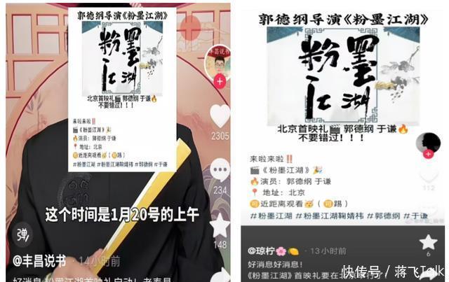 二、真假“首映礼” 2025年1月初,一些相声圈自媒体发布消息称,电影《粉墨江湖》将于1月20日上午在北京举办首映礼。 《粉墨江湖》是郭德纲自编自导的电影,由秦霄贤和鞠婧祎主演,早在2022年就杀青了,但不知道为什么却一直没有上映。 虽然相声圈自媒体发布的所谓“首映礼通告”漏洞百出,但还是有些人相信了,结果可想而知,不仅所谓首映礼是假的,《粉墨江湖》直到2026年元旦都没有上映,而且已经可以算遥遥无期。
